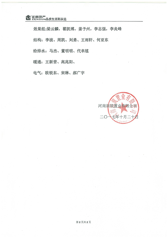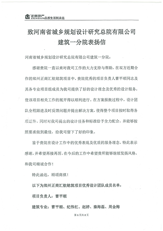 正商地產(chǎn)致河南省城鄉(xiāng)規(guī)劃設(shè)計研究總院有限公司 建筑一分院表揚信