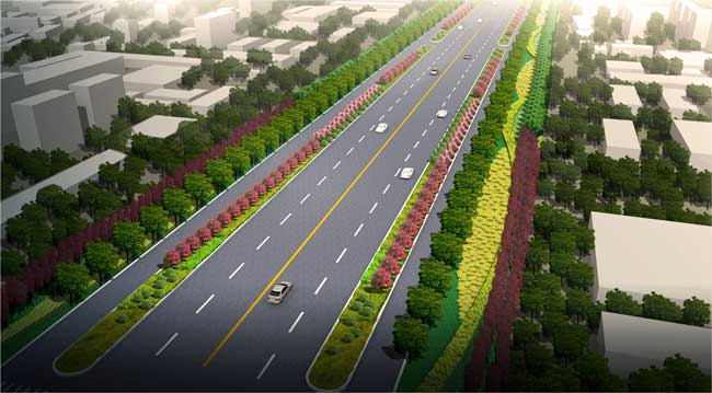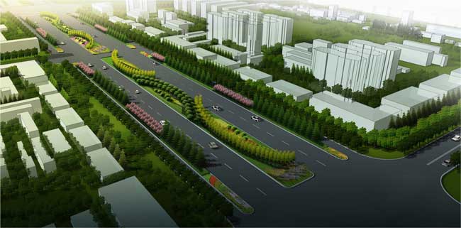 項(xiàng)目簡介:淇縣泰山路向西為西部山區(qū),為連接城市與自然山林的田園之路,向東為鶴壁新區(qū),為溝通城鄉(xiāng)一體化建設(shè)的現(xiàn)代大道。以此為設(shè)計(jì)構(gòu)思,對其進(jìn)行道路景觀設(shè)計(jì)。植物以自然式設(shè)計(jì)為主,分車綠帶選用高桿紅葉石楠、黃山欒作為骨干樹種;兩側(cè)綠帶充分考慮到對兩側(cè)未建設(shè)用地的遮擋,選擇紫葉李、碧桃、石楠等,形成郁閉性較強(qiáng)的景觀效果;行道樹則選擇法桐,高大優(yōu)美。
